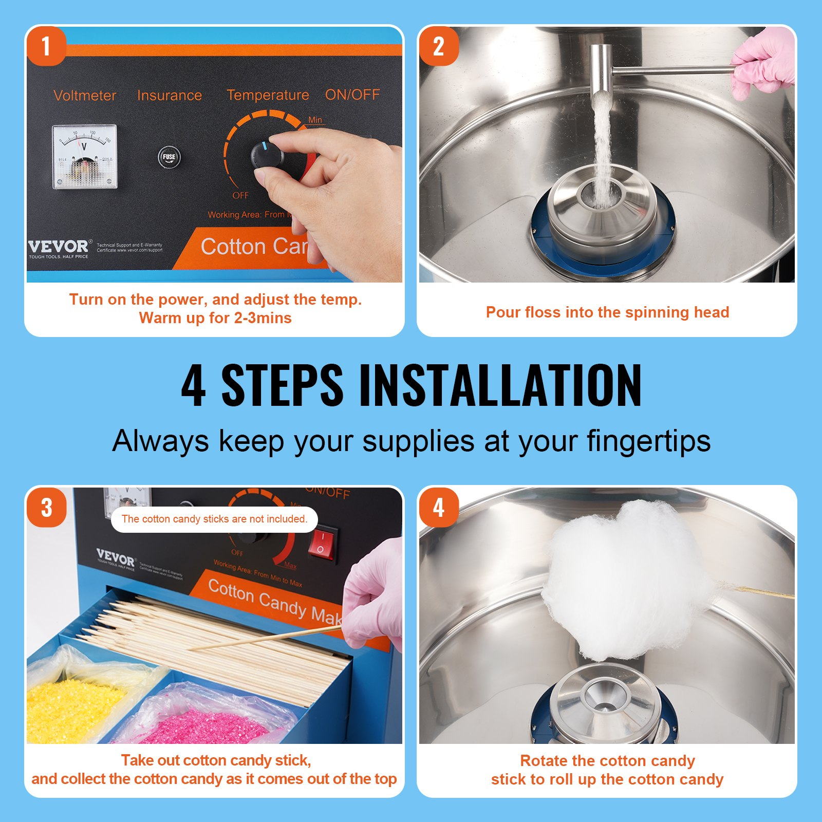VEVOR Electric Cotton Candy Machine, 1000W Candy Floss Maker, Commercial Cotton Candy Machine with Stainless Steel Bowl, Sugar Scoop, and Drawer, Perfect for Home Kids Birthday, Family Party, Blue