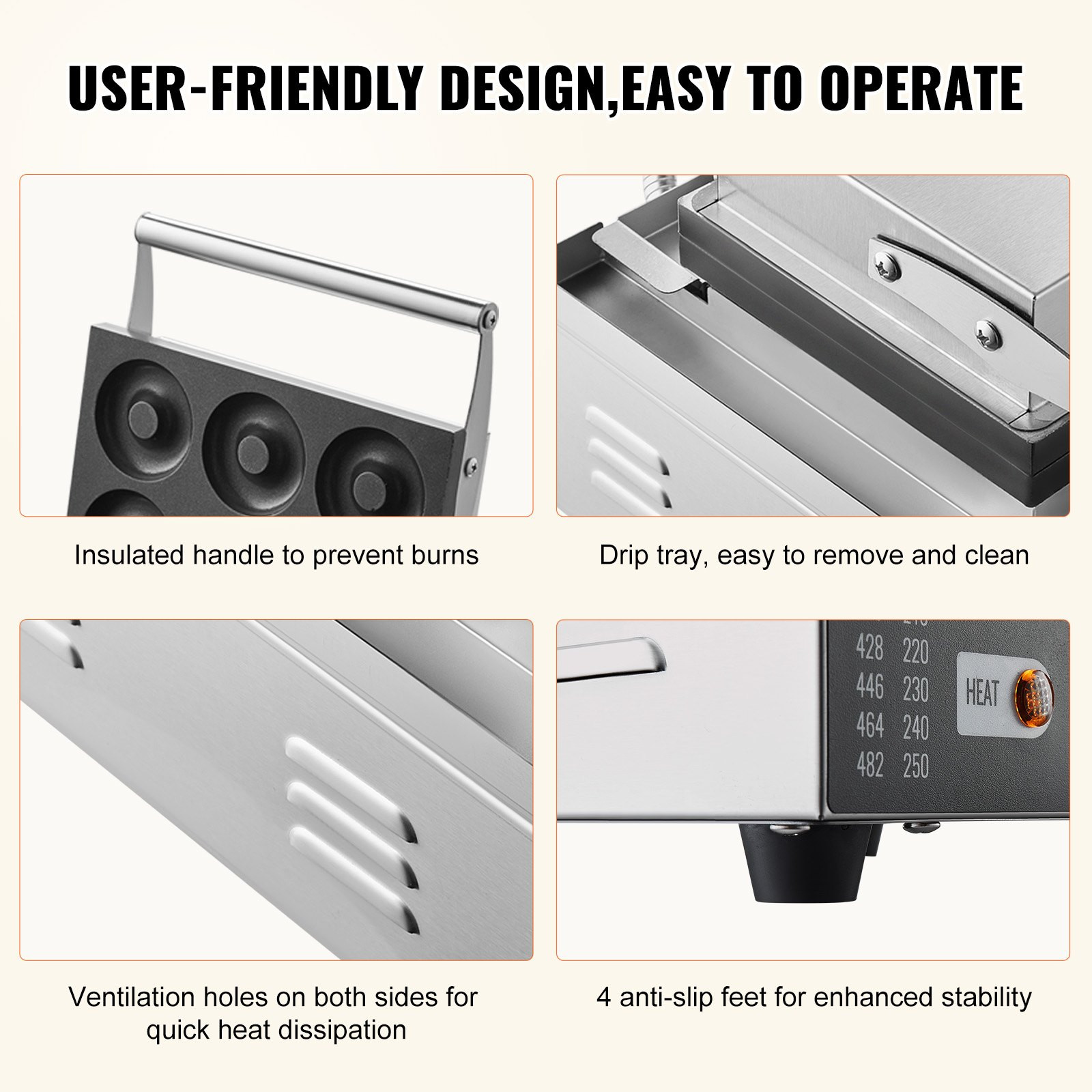 VEVOR Electric Donut Maker, 1550W Commercial Doughnut Machine with Non-stick Surface, 6 Holes Double-Sided Heating Waffle Machine Makes 6 Doughnuts, Temperature 122-572℉, for Restaurant and Home Use