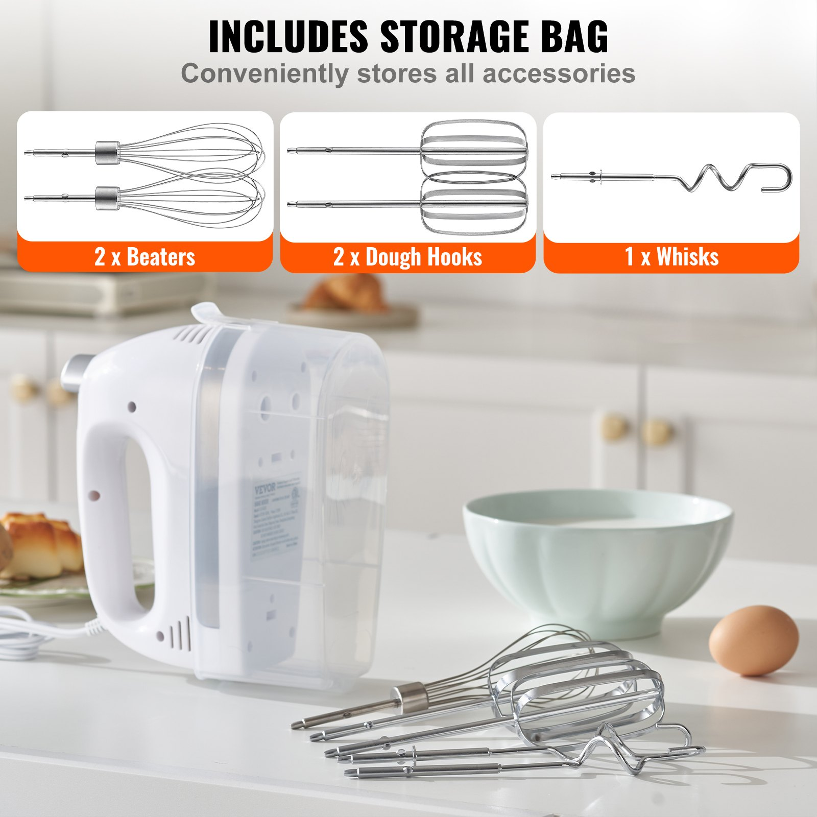 VEVOR Electric Hand Mixer, 5-Speed, 250 Watt Portable Electric Handheld Mixer, with Turbo Boost Beaters Dough Hooks Whisk Storage Case, Baking Supplies for Whipping Mixing Egg Cookie Cake Cream Batter