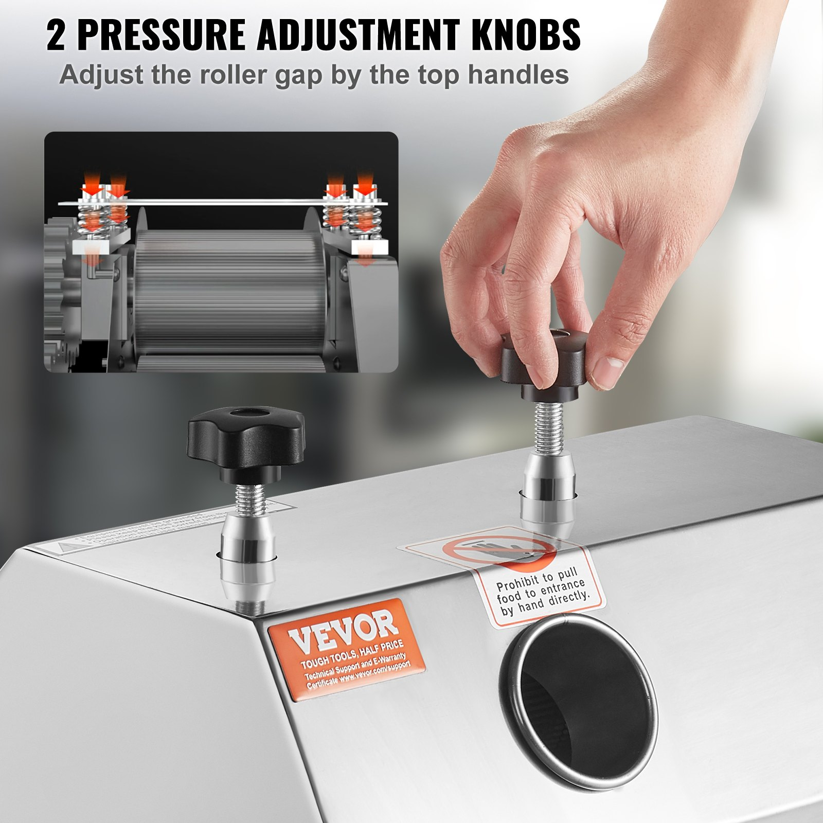 Production Efficiency: 661 lbs/h (300 kg/h),Control Mode: Electric,Wheels Size: 1.5-inch x 4PCS,Item Model Number: YF-L80-115,Rated Power: 750W,Net Weight: 117 lbs / 53 kg,Main Material: SUS201 Stainless Steel