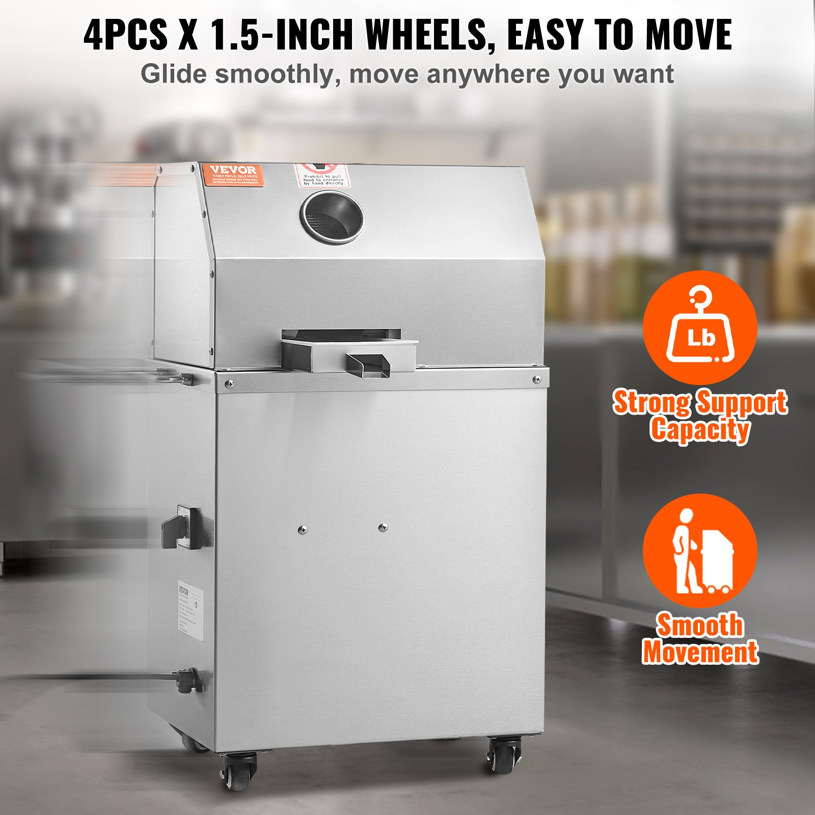 Production Efficiency: 661 lbs/h (300 kg/h),Control Mode: Electric,Wheels Size: 1.5-inch x 4PCS,Rollers Material: SUS304 Stainless Steel,Housing Material: SUS201 Stainless Steel,Item Model Number: YF-L90-115,Rated Power: 800W,Net Weight: 117 lbs / 53 kg