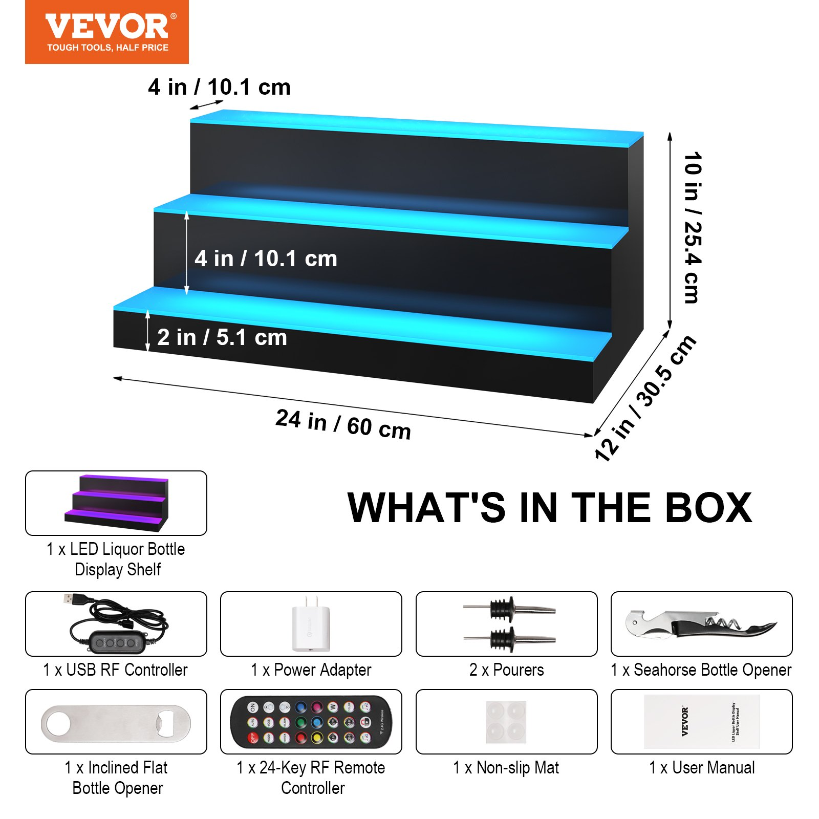 VEVOR LED Lighted Liquor Bottle Display Bar Shelf RF & App Control 24" 3-Step