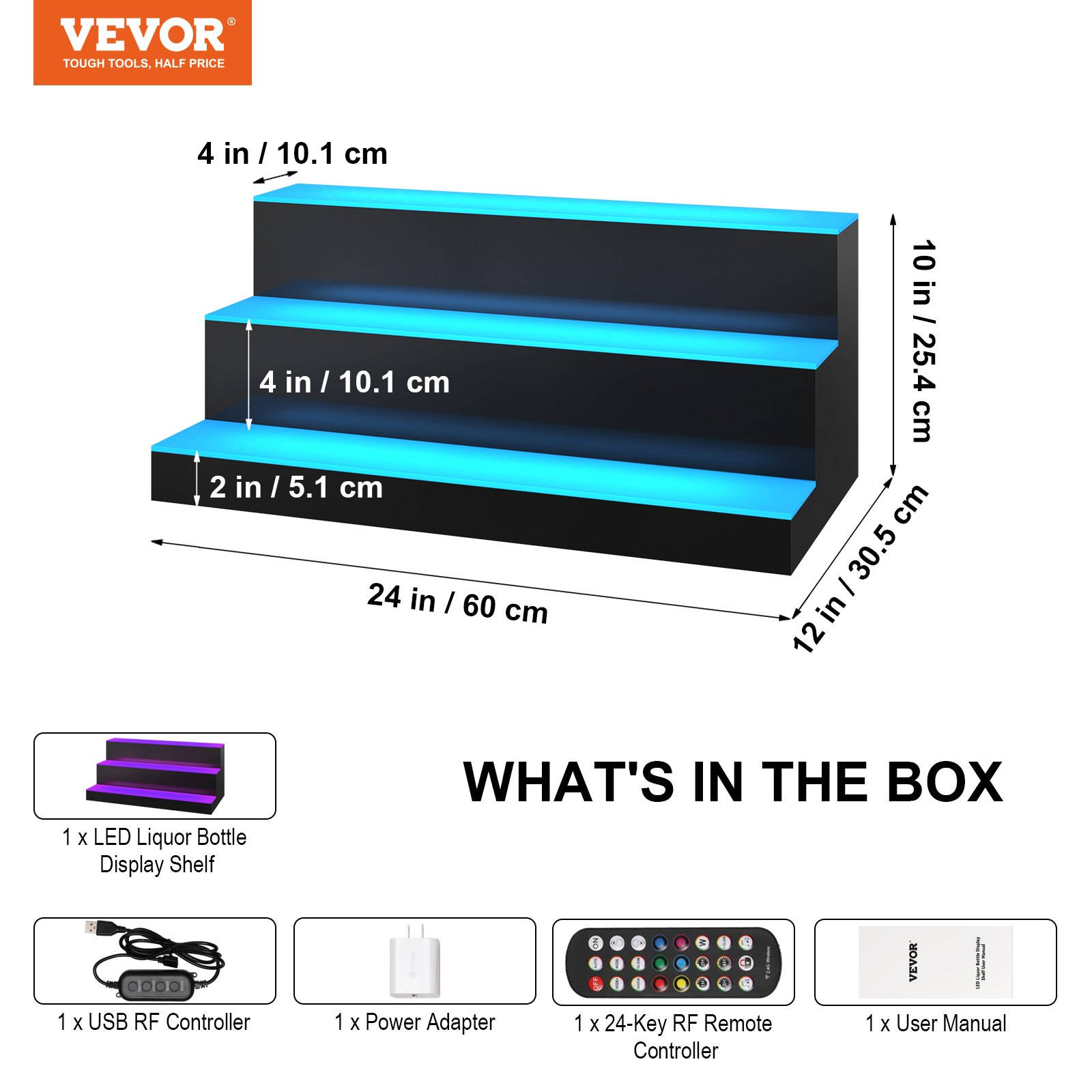 Power Cable Length: 4 ft / 1.2 m,Capacity: Around 18 Bottles,Model: 3 Layer 24 Inches,Material: Premium Acrylic,Control Methods: RF Remote Control & App Control,Control Range: 16-26 ft / 5-8 m,Item Weight: 9.5 lbs / 4.31 kg