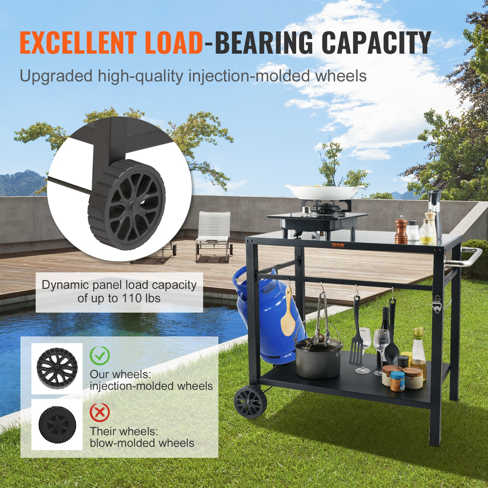 VEVOR Outdoor Grill Dining Cart with Double-Shelf, BBQ Movable Food Prep Table, Multifunctional Iron Table Top, Portable Modular Carts for Pizza Oven, Worktable with 2 Wheels, Carry Handle, Black