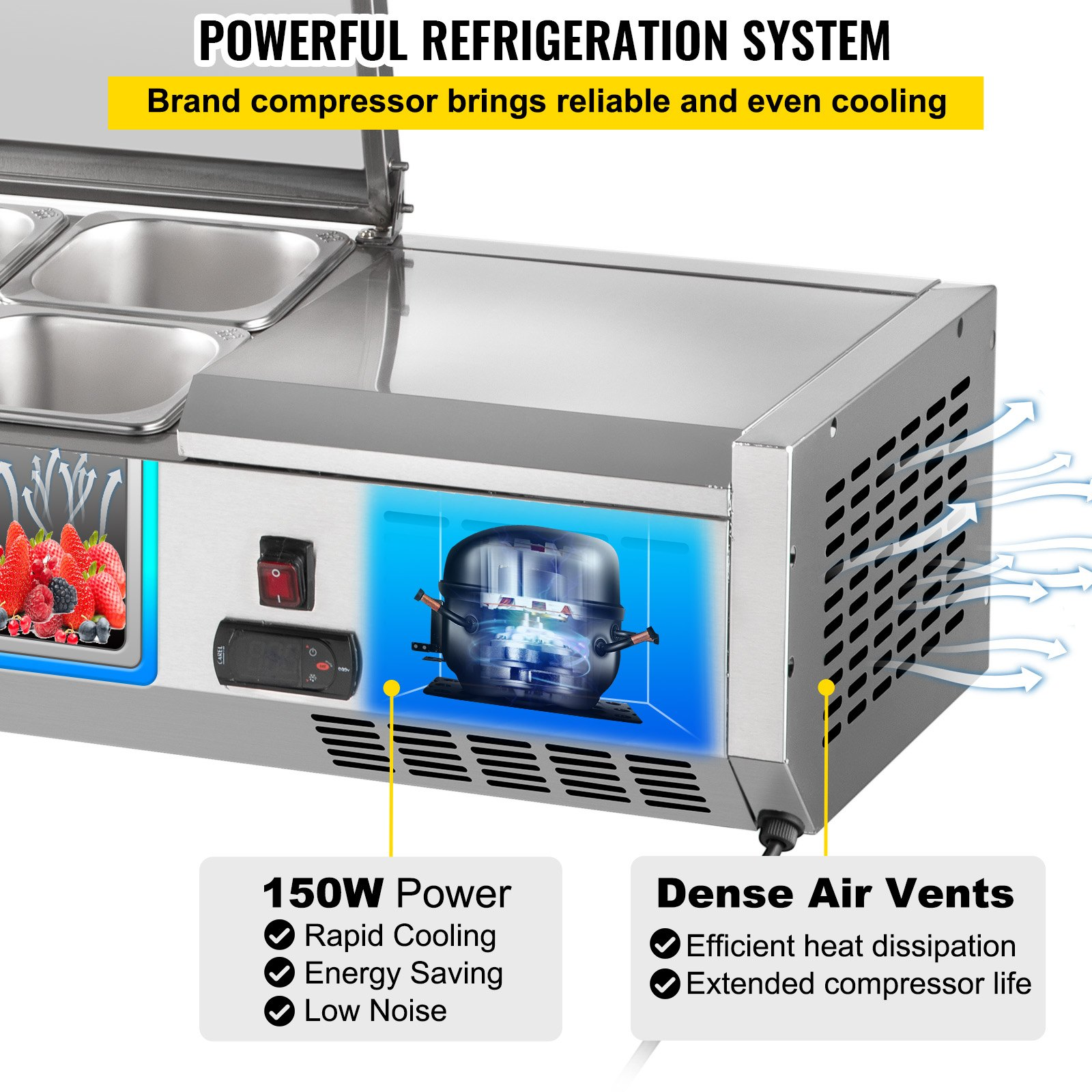 VEVOR Refrigerated Condiment Prep Station, 40-Inch, 7.8 Qt Sandwich/Salad Prep Table with 1 1/3 Pan & 4 1/6 Pans, 150W Salad Bar with 304 Stainless Body and Cover Temp Adjuster One-Click Defrosting