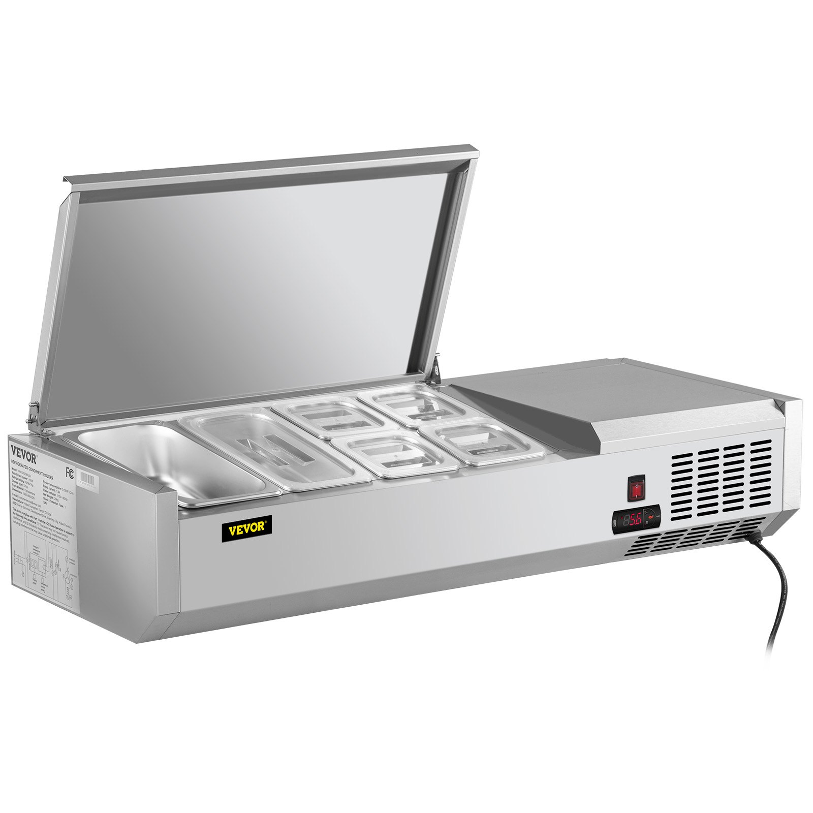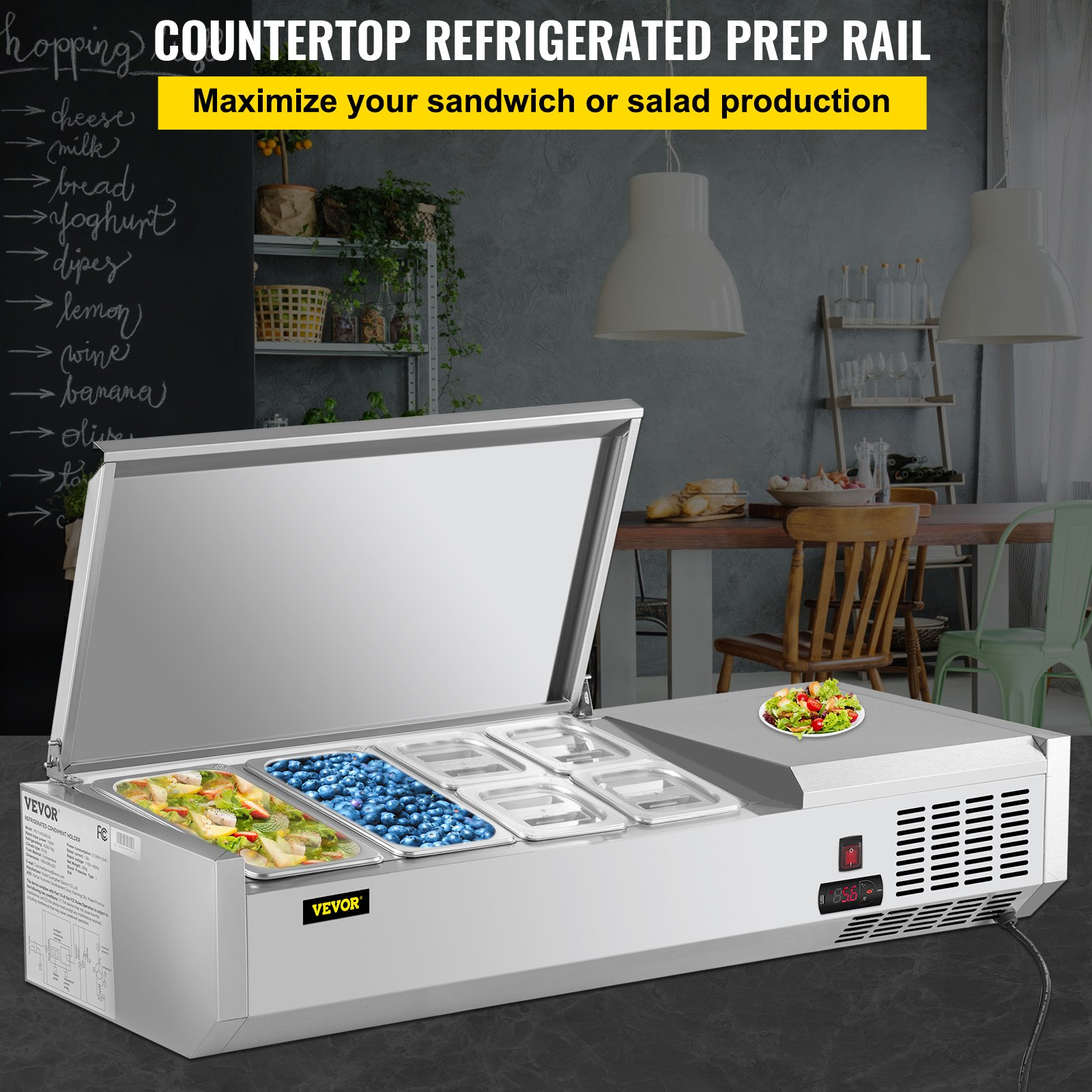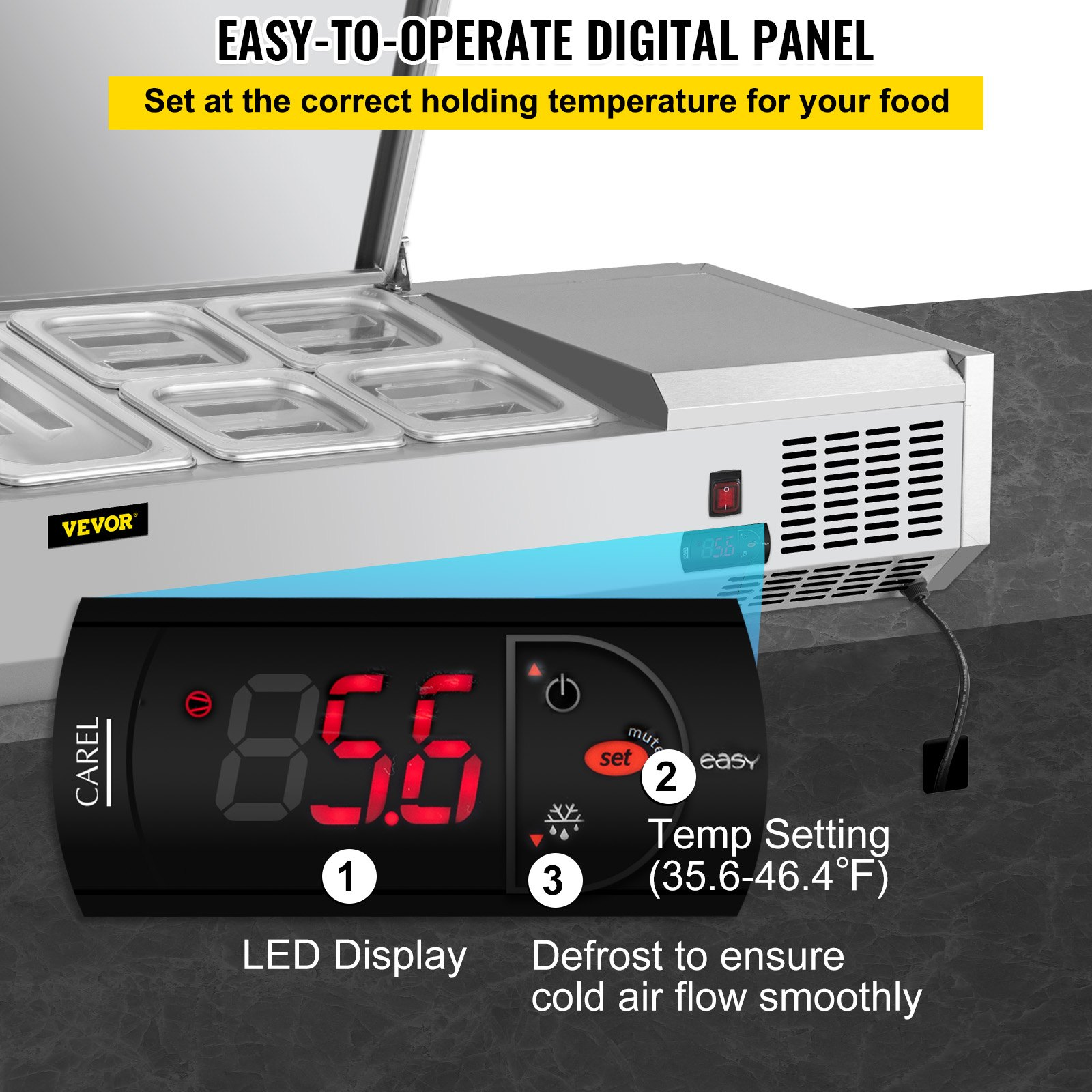 VEVOR Refrigerated Condiment Prep Station, 48-Inch, 10.8Qt Sandwich/Salad Prep Table with 2 1/3 Pans & 4 1/6 Pans, 150W Salad Bar with 304 Stainless Body and Cover Temp Adjuster One-Click Defrosting