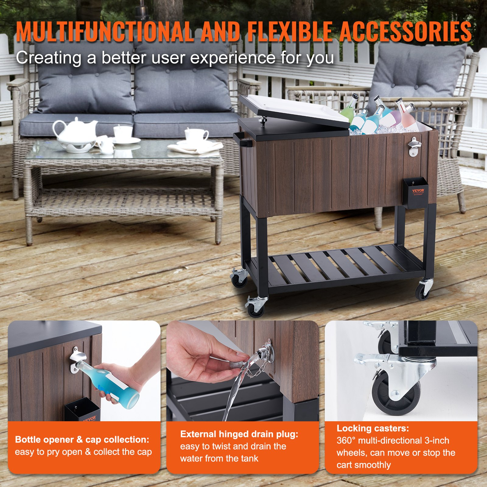 VEVOR Rolling Ice Chest Cooler Cart 80 Quart, Portable Bar Drink Cooler, Beverage Bar Stand Up Cooler with Wheels, Bottle Opener, Handles for Patio Backyard Party Pool, Wooden Teak Accent, Brown