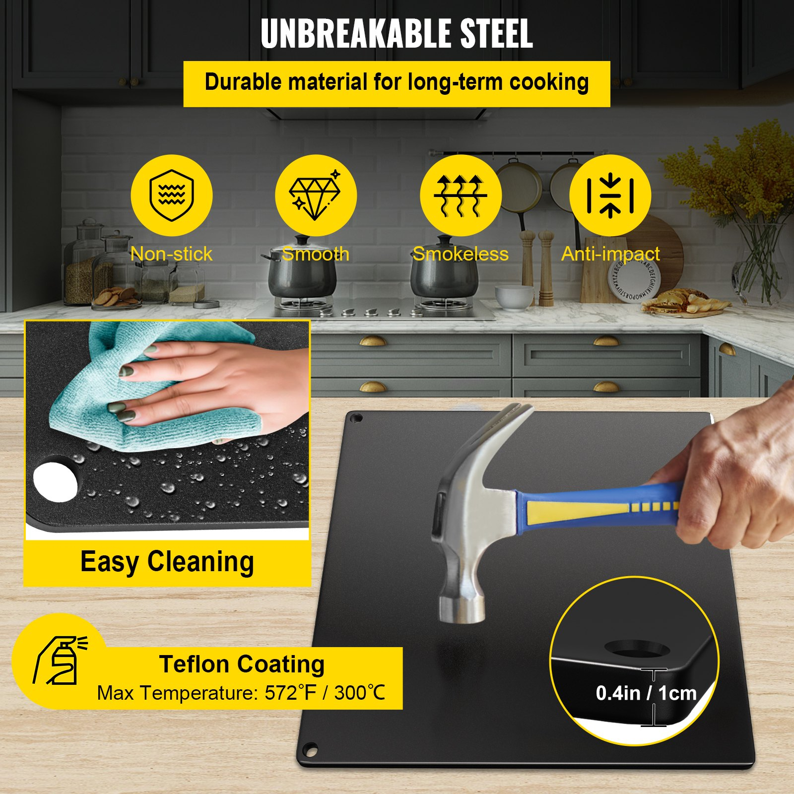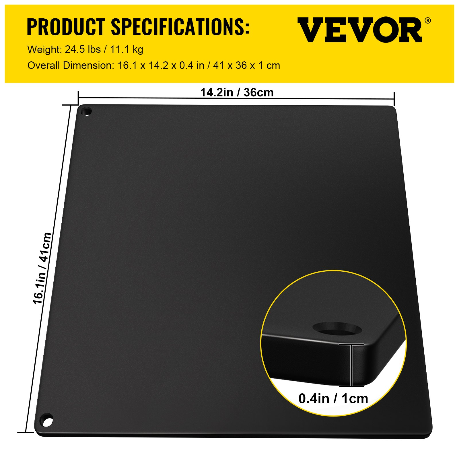 Thickness: 0.4 in / 10 mm,Max Temperature: 572℉ / 300℃,Item Dimension: 16.1 x 14.2 x 0.4 in / 41 x 36 x 1 cm,Color: Black,Model: vv-ps-104136,Material: Steel,Coating: Double-sided Coating,Finish: Teflon Coating,Item Weight: 24.5 lbs / 11.1 kg