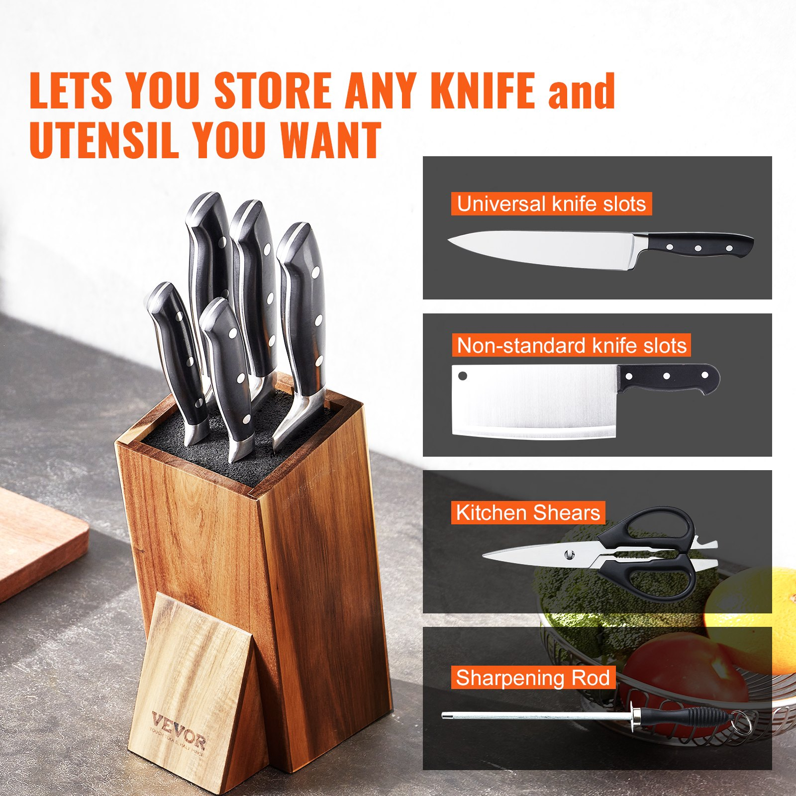 VEVOR Universal Knife Holder, Acacia Wood Knife Block Without Knives, Extra Large Knife Storage Holder Stand with PP Brush, Multifunctional Wooden Knife Organizer, Knife Rack for Kitchen Counter