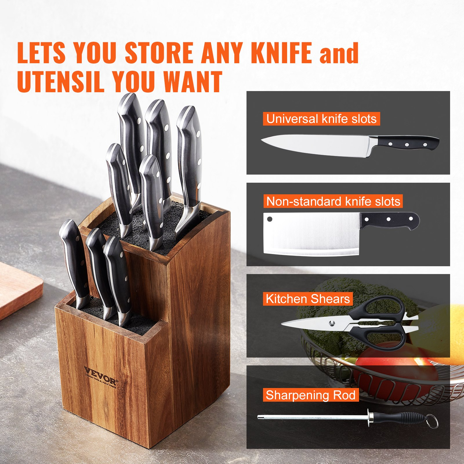 VEVOR Universal Knife Holder, Acacia Wood Knife Block Without Knives, Two-Tier Knife Storage Stand with PP Brush, Extra Large Multifunctional Wooden Knife Organizer, Knife Rack for Kitchen Counter