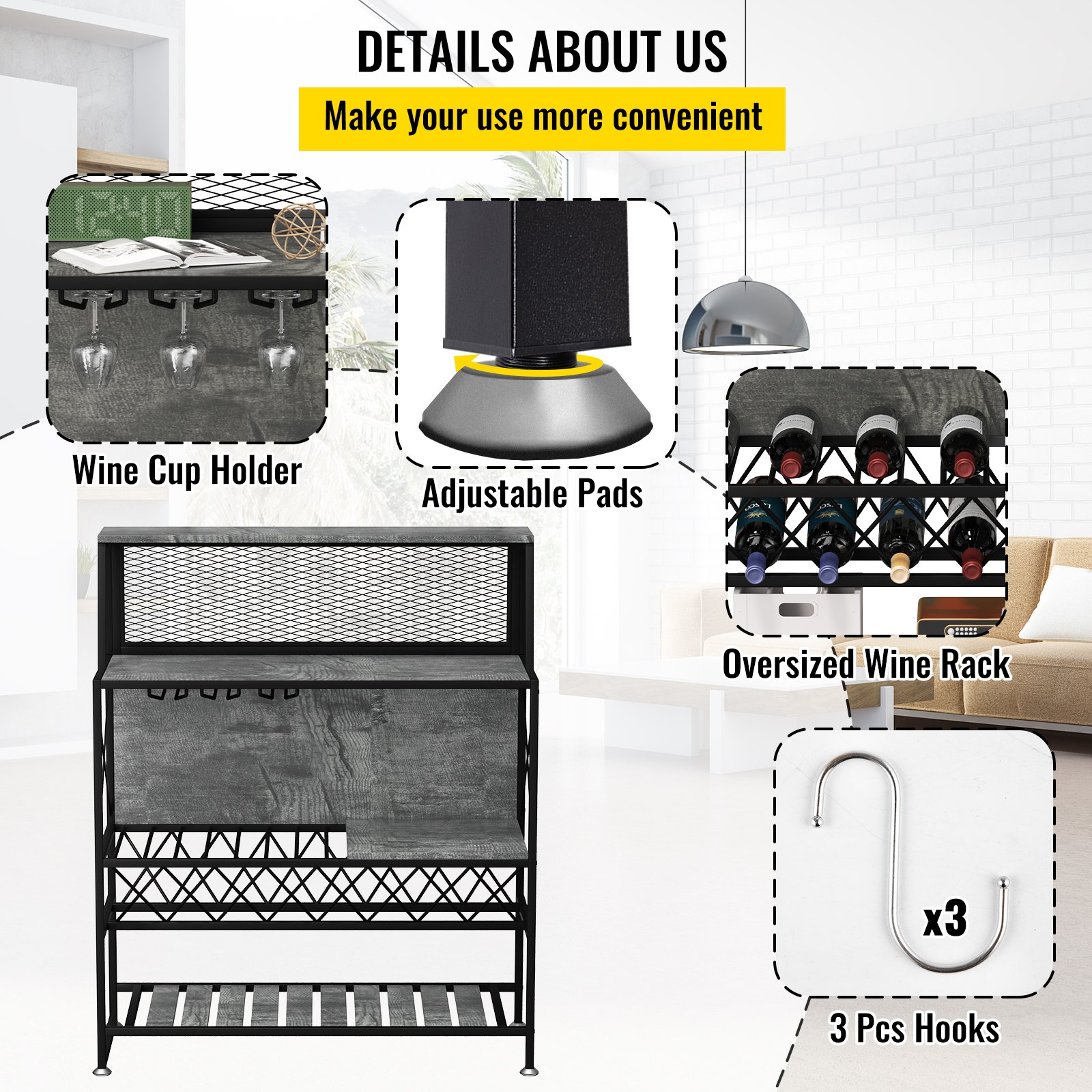 VEVOR Wine Rack Home Bar Table, Industrial Liquor Storage Cabinets with Glass Holder, Bakers Rack Freestanding with Large Capacity for Home Kitchen Dining Room, Hold 12 Bottles of Wine (Gray)