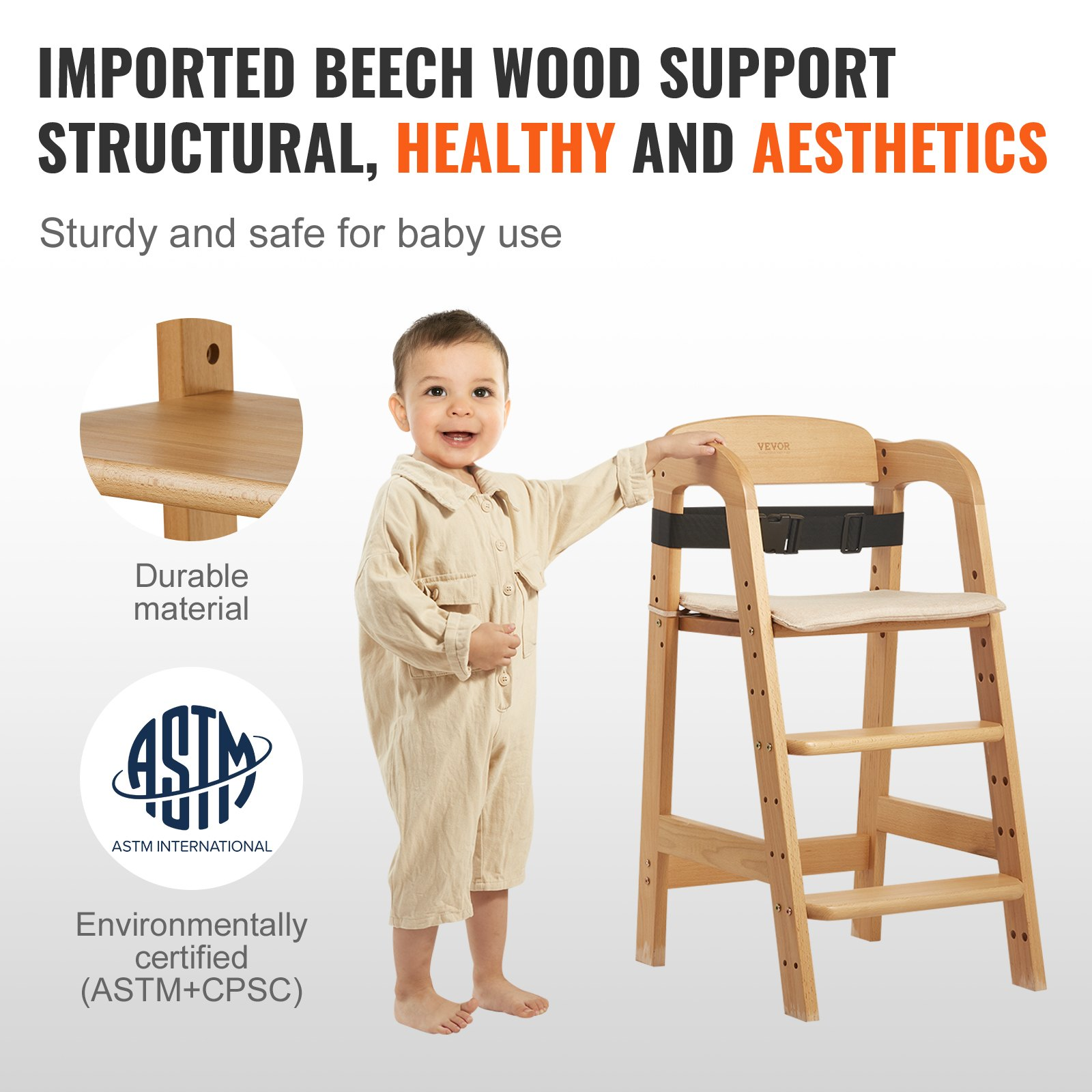 VEVOR Wooden High Chair for Babies & Toddlers, Convertible Adjustable Feeding Chair, Eat & Grow High Chair with Seat Cushion, Portable Baby Dining Booster Seat, Beech Wood Toddler Chair, Natural