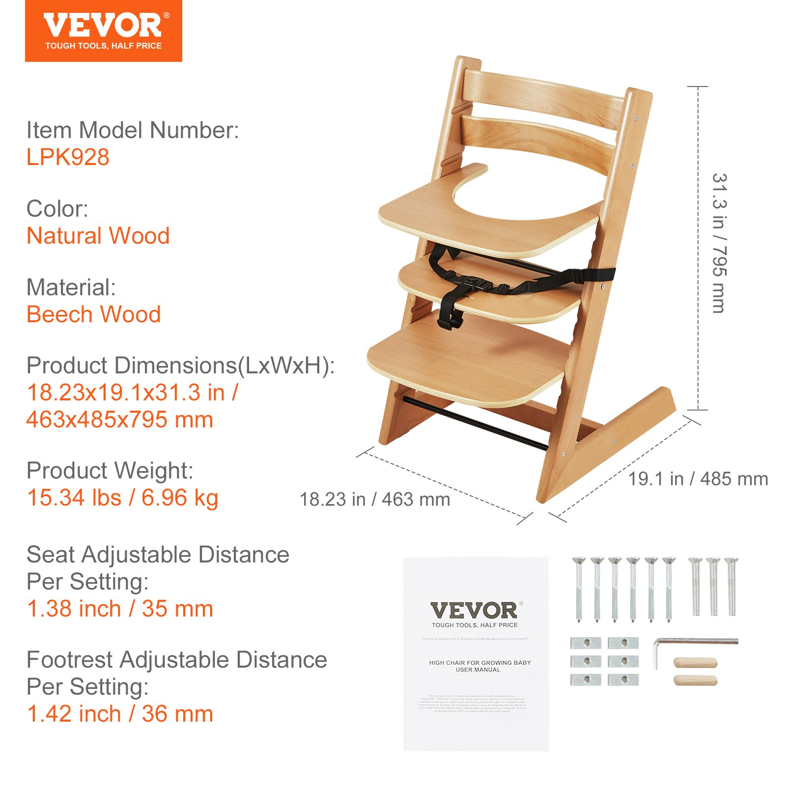 Seat Adjustable Distance Per Setting: 1.38 inch / 35 mm,Color: Natural,Item Model Number: LPK928,Product Weight: 15.34 lbs / 6.96 kg,Material: Beech Wood,Product Dimensions: 18.23x19.1x31.3 inch / 463x485x795 mm,Footrest Adjustable Distance Per Setting: 1.42 inch / 36 mm